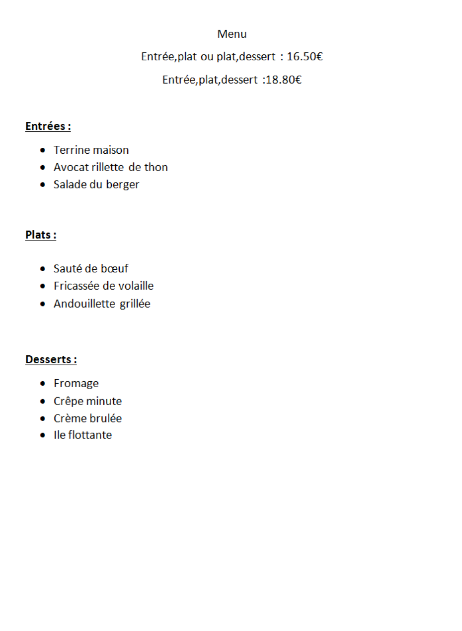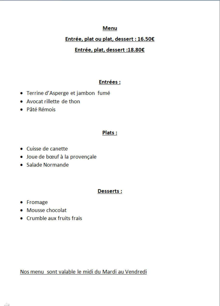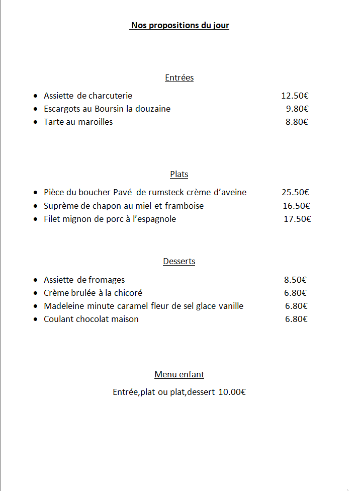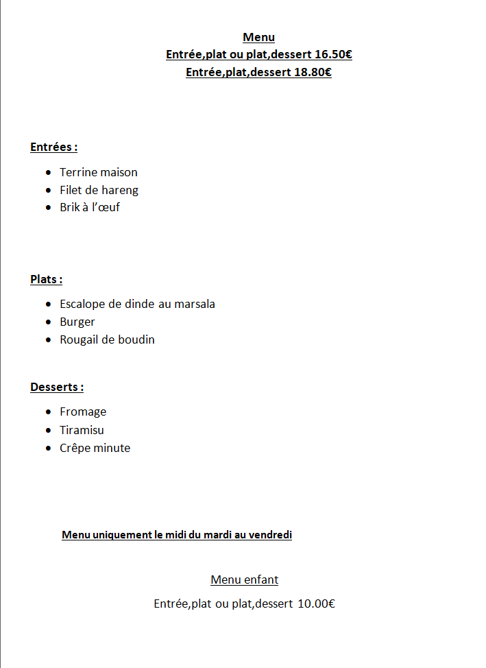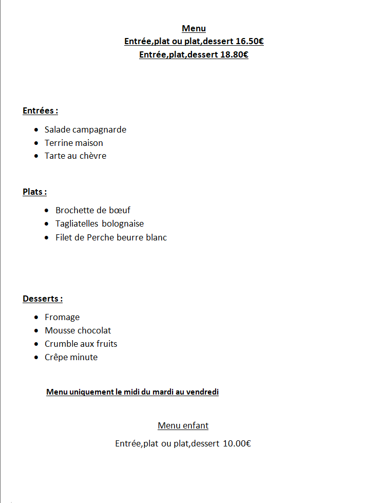 Restaurant du Mardi au dimanche 10h00 à 14h00