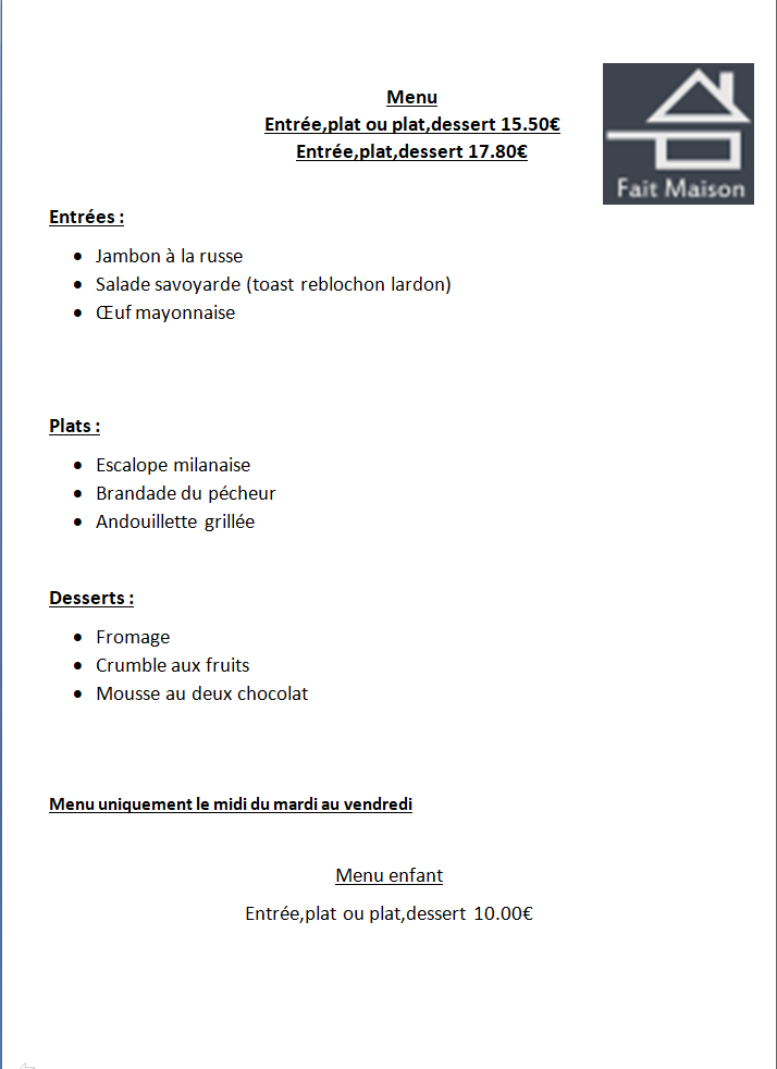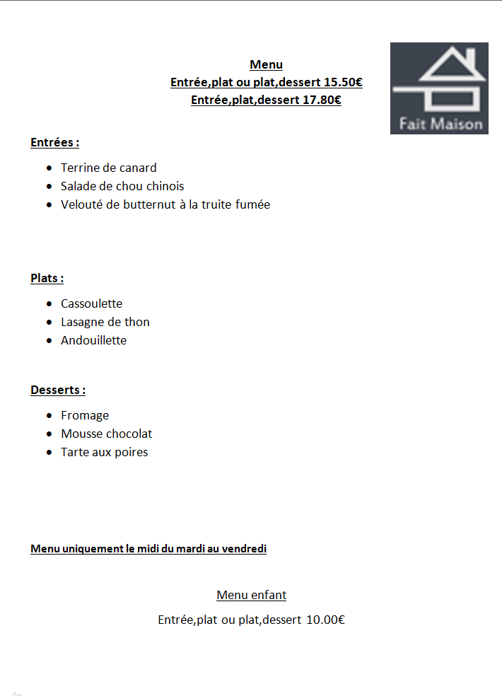 Restaurant Nouveau Horaire à compter 15 septembre du Mardi au dimanche 10h00 à 14h00
